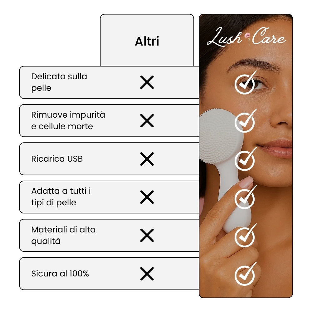 La nostra spazzola offre una pulizia più profonda, pelle più liscia e luminosa, riduzione delle impurità e una sensazione immediata di freschezza.